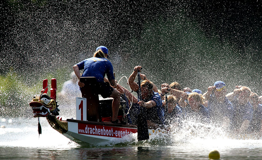 ドラゴンボートは、古代中国で生まれた世界最古の手漕ぎ舟のレース大会が起源とされ、30カ国以上で世界統一規格のレースが行なわれています。合計22名が乗り組み、パワーはもちろん、クルー全員がタイミングを合わせる“呼吸”が勝敗を分ける競技です。公式競技種目は、オープン・女子・混合・ジュニア・シニアの5種目で、それぞれ250メートル、500メートル、1000メートルでタイムを競います。
